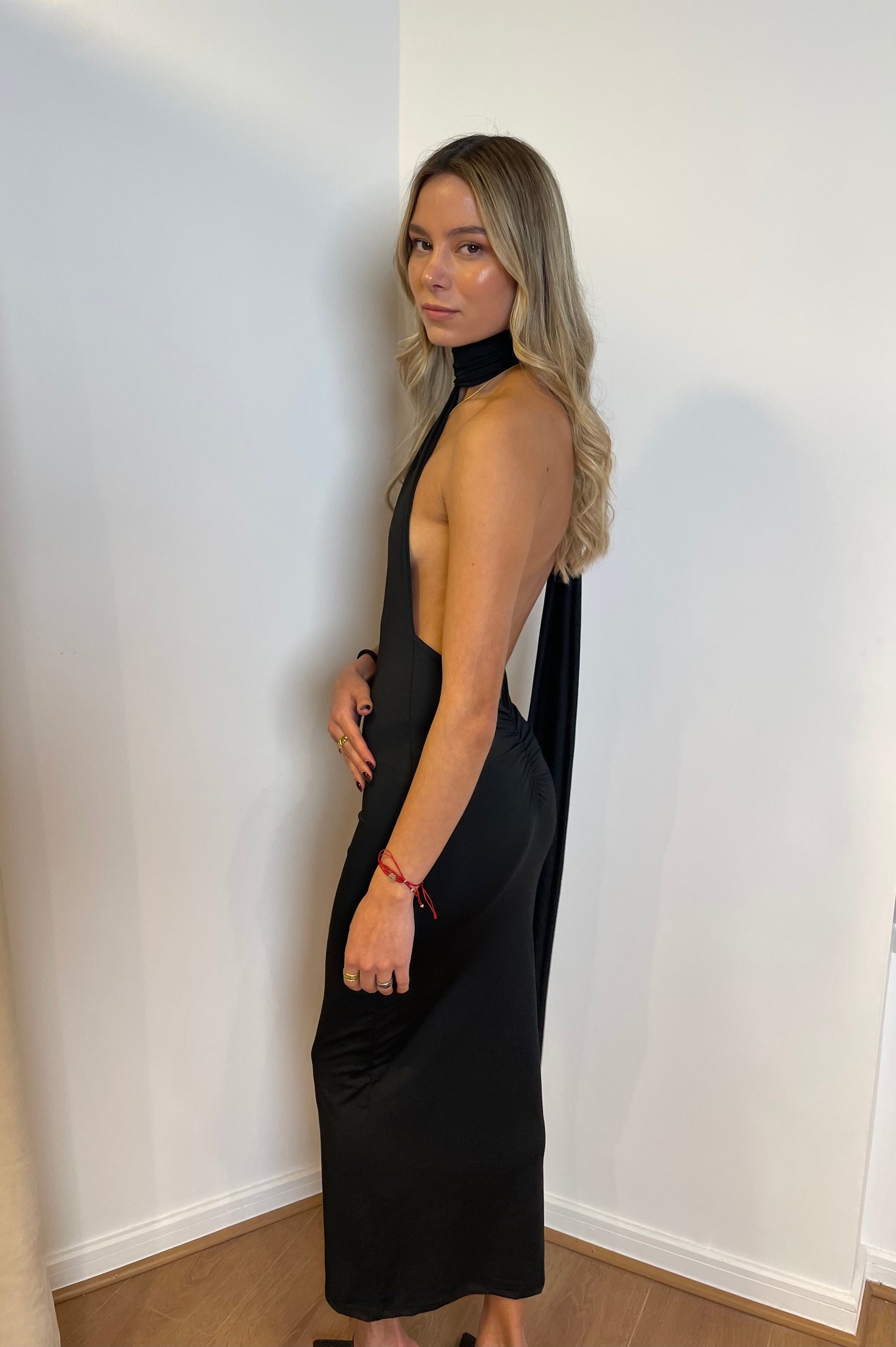 Vestido negro confeccionado con tela duplex, una espalda descubierta y ajustable al cuello.